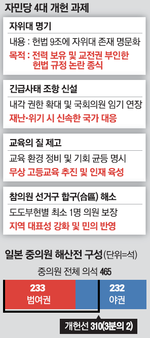 찬성한 후보들을 대상으로 개헌 내용을 복수 응답으로 물은 결과 가장 많은 선택을 받은 항목은 ‘자위대 근거 규정’으로 80%에 달했다. 이어 ‘긴급사태 조항 신설’(65%), ‘참의원 선거구 합구 해소’(38%) 순이었다. 이들 항목은 자민당이 제시한 4대 개헌 과제에 포함돼 있다.
