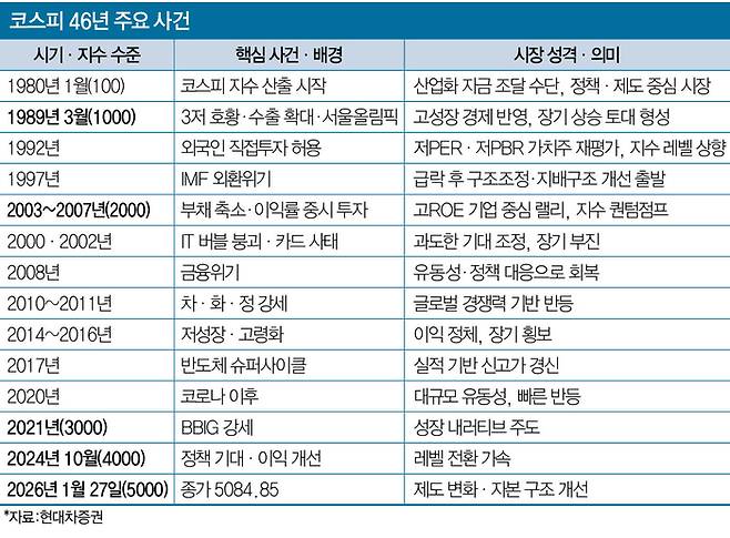한국 증시가 코스피 5000 시대를 열었다. 코스피는 1980년 1월 4일 100포인트를 기준으로 출발한 이후 46년 만에 5000선을 돌파했다. 4000에서 5000까지는 3개월도 걸리지 않을 만큼 상승 속도가 가팔랐다. ▲산업화와 제도 정비 ▲외국인 투자 개방 ▲구조조정과 고(高)ROE(자기자본이익률) 중심 투자 확산 ▲반도체·IT·BBIG 등 시대별 주도 산업 교체를 거치며 굴곡진 여정을 이어온 결과다.