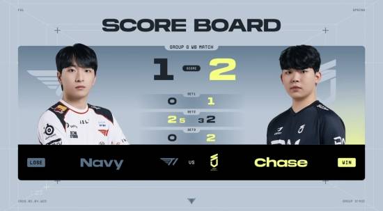 첫 번째 경기는 T1 'Navy' 김유민 선수와 DN 수퍼스(DNS) 'chase' 권창환 선수의 그룹 G조 승자조 매치.