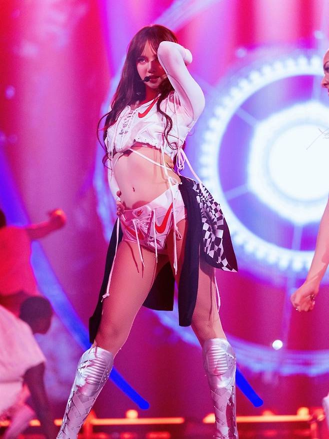 가장 화제를 모은 의상은 유명 스포츠 브랜드의 스니커즈를 파격적으로 리폼한 화이트 셋업이다. 리사는 운동화의 디테일을 살린 뷔스티에와 쇼츠를 착용, 힙하면서도 스포티한 매력을 극대화했다.