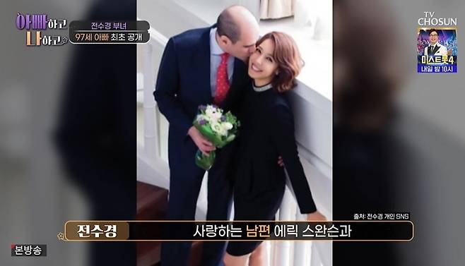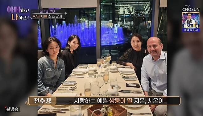 딸 대표로 출격한 전수경은 "저희 가족은 오빠와 저, 오빠 가족과 남편 에릭 스완슨과 쌍둥이 딸 지온, 시온, 그리고 1930년생 아버지"라고 소개했다. 이어 전수경의 아버지가 등장했고, 한혜진과 전현무는 "97세 맞으시냐", "진짜 정정하시다"고 놀랐다. 전수경 아버지는 딸에 관해 "효녀라고 말하고 싶다. 내가 출세시키려고 하지 않았는데, 스스로 세파를 뚫고 나갔다. 아주 찬양한다"라고 애정을 드러냈다.