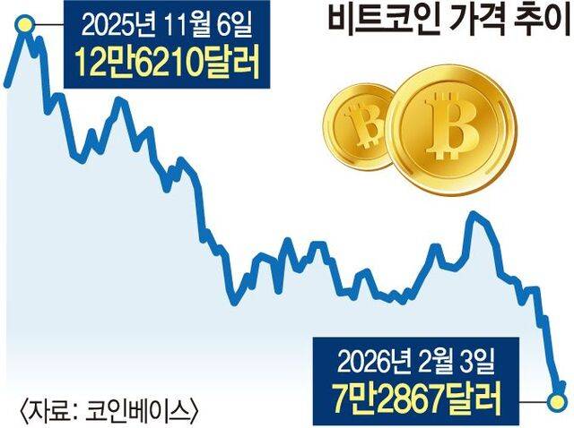 가상자산(암호화폐) 대장주 비트코인의 끝 모를 추락이 계속되고 있다. ‘디지털 금(金)’으로 평가받던 과거의 영광이 무색해졌다. 비트코인은 3일(미 동부시간) 장중 한때 7만2000달러선까지 하락하며 15개월 만에 최저 수준으로 내려앉았다. 세계 최대 비트코인 보유기업 미국 스트래티지의 평단가를 밑도는 수준이어서 ‘비트코인 추가 하락’을 예상하는 분석도 나온다.