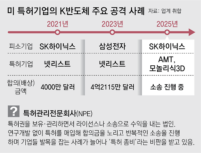 삼성전자와 SK하이닉스 등 한국 반도체 기업들이 최근 역대급 실적을 내면서 합의금을 노리는 특허관리전문회사(NPE)의 공세가 더욱 공격적으로 바뀌고 있다.