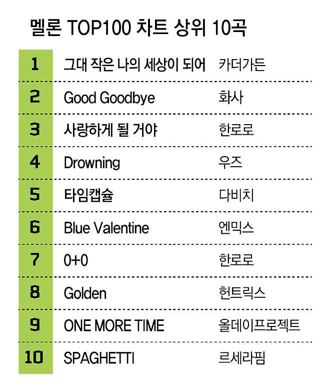 #2. 카더가든이 2021년 발표했던 곡 ‘그대 작은 나의 세상이 되어’는 최근 멜론 TOP100 차트 정상에 올랐다. 연애 예능 프로그램 ‘환승연애4’에서 출연자들의 과거 연애 서사를 상징하는 곡으로 쓰이며 주목받아 역주행을 거듭한 결과다. 카더가든은 1위 소식을 접한 뒤 소셜미디어에 “살다 보니 별일이 다 있다”며 “노래를 들어주신 모든 분들께 감사하다”는 소감을 남겼다.