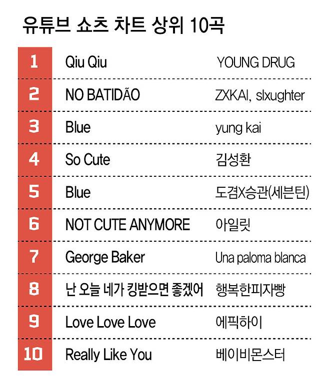 쇼츠 차트 1위에 오른 중국 가수 YOUNG DRUG의 ‘Qiu Qiu’는 특정 가사가 한국어로 ‘척추’처럼 들린다는 이유로 밈을 타며 확산됐다. 2위인 Zxkai & Slxughter의 ‘No Batidão’은 댄스 챌린지가 핫해지면서 자주 소비됐다. 음악 자체의 완결성이나 인기보다는 이 음악이 ‘어떻게 쓰기 좋은가’라는 영상 소비적 관점에서 순위가 매겨진 셈이다.