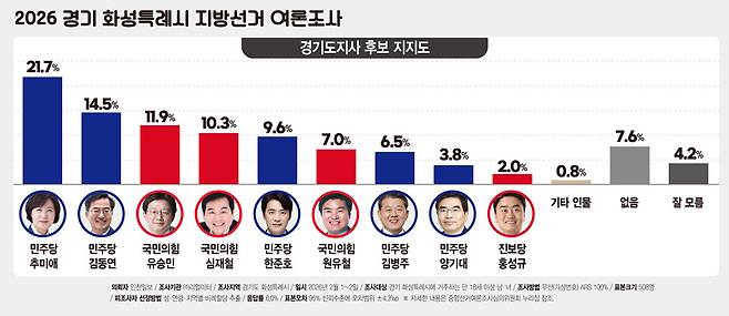 화성특례시 여론조사에서 경기도지사 출마가 거론되는 인물 가운데 추미애 전 더불어민주당 대표와 김동연 경기지사가 오차범위 내 접전을 벌였다.