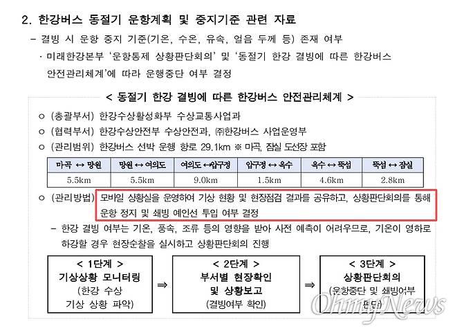 안전관리계획 생산이 늦어진 이유에 대해 서울시 관계자는 "결빙이 됐을 때 언제 쇄빙 예인선(민간기업 소유)을 투입할지, 기온이 떨어지면 현장에 출동하고 어떻게 어떻게 대처한다 등의 업무 처리 방침은 내부적으로 있었다"면서 "이것을 결빙 안전관리계획으로 문서화해 정리해놓은 때가 1월 20일"이라고 설명했다.