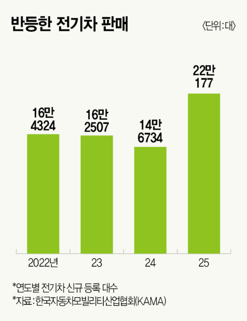 한국자동차모빌리티산업협회(KAMA) ‘2025년 국내 전기차 시장 결산’ 보고서에 따르면 지난해 국내 전기차 신규 등록은 22만177대를 기록했다. 1년 전보다 50% 증가한 수치다. 국내 전기차 신규 등록은 2023년 1% 줄어든 데 이어, 2024년 10% 급감하며 2년 연속 하락세를 보였다. 그러나 3년 만에 역성장 흐름을 끊고 반등에 성공했다. 지난해 전기차 침투율은 13.1%를 기록하며 사상 처음으로 두 자릿수를 돌파했다.