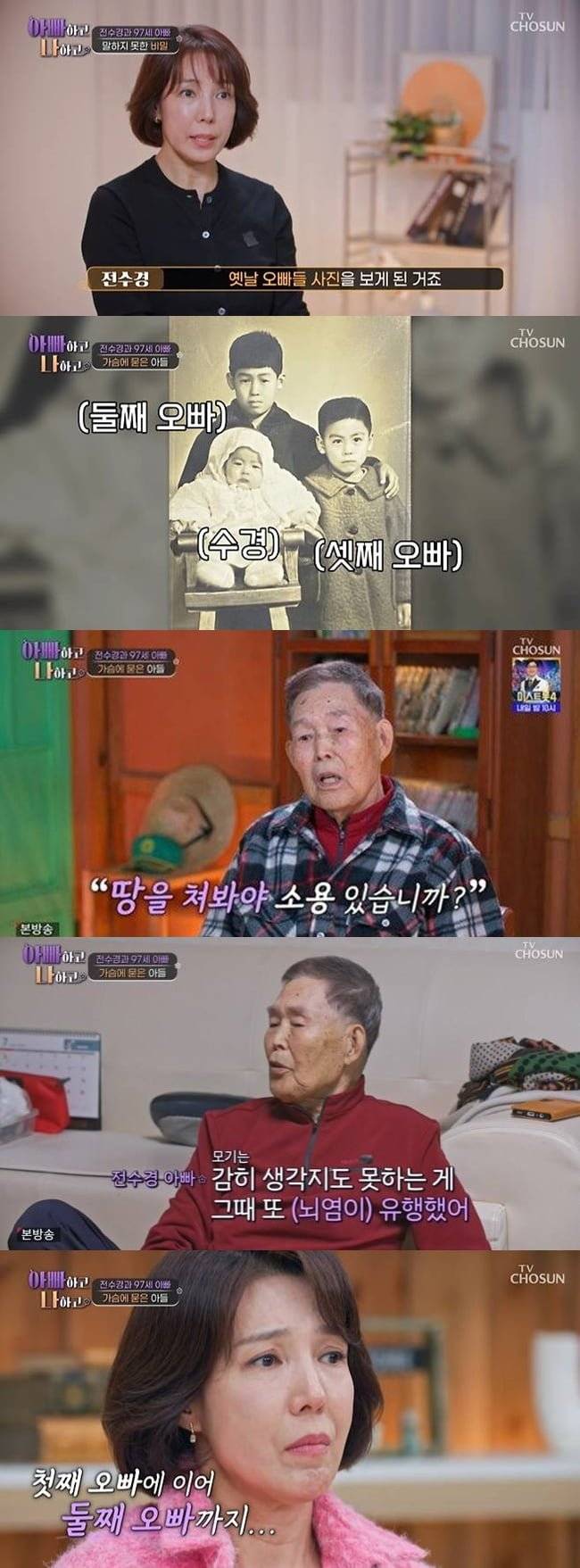 전수경은 "어릴 때는 오빠랑 나만 있는 줄 알았다. 근데 초등학교 때 가족 사진을 보다가 옛날 오빠들 사진을 보게 된 거다"라고 세상을 떠난 두 오빠에 대해 말했다.