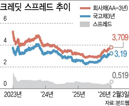 4일 본드웹에 따르면 전날(3일) 오후 기준 ‘AA-’등급 회사채 3년물과 국고채 3년물 간 크레딧 스프레드는 51.9bp를 기록했다. 스프레드는 올해 초 52.4bp에서 지난달 20일 46.2bp까지 축소된 뒤 다시 확대돼 최근 50~52bp 수준에서 등락을 이어가고 있다. 크레딧 스프레드는 확대될수록 회사채의 상대적 약세를 의미한다.
