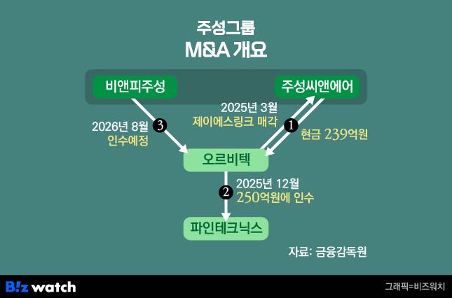 현재 진행 중인 오르비텍 인수 절차가 마무리되면 그 자회사인 파인테크닉스의 경영권까지 동시에 확보하게 된다. 이를 통해 주성그룹은 기존 상장 계열사인 주성코퍼레이션에 이어 제이에스링크, 오르비텍, 파인테크닉스를 더해 총 4곳의 코스닥 상장사 포트폴리오를 보유하게 된다. 1년 만에 상장사 3곳이나 늘린 것이다.