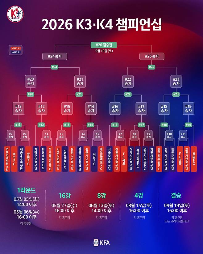 K3·K4리그는 3월 7일 개막하며, 지난 1월 이사회에서 결정된 것처럼 2026 시즌 K3리그는 14팀, K4리그는 13팀 체제로 운영된다. K리그2와 K3리그 간 승강은 2026 시즌 성적을 기준으로 시행된다.