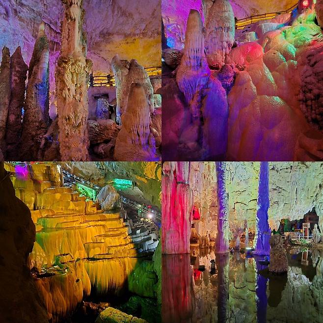 신녀궁 올라가는 길에 불진(拂塵)이라는 두 글자가 보이는데, 속세의 티끌을 떨쳐버리고 선계로 들어간다는 의미다. 그러므로 신녀는 선녀의 다른 이름이다. 선녀처럼 아름다운 종유석이 영롱하고 투명하고 정교해서 그런 이름이 붙었다. 이들 종유석이 화려한 조명 속에서 노래하고 춤을 추는 것처럼 생동감이 있다. 신녀궁을 내려오면 다시 속세로 돌아와 구불구불 종유동굴을 따라 내려간다.