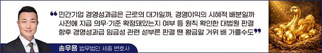 온 국민들의 부러움을 샀던 그 경영성과급이 임금에 해당하는지에 대하여도 이제 곧 대법원의 판단이 나올 것이다. 부디 경영성과급의 임금성에 대한 섣부른 판단으로 황금알을 낳는 거위의 배를 가르는 우를 범하는 일은 없기를 기대해 본다.