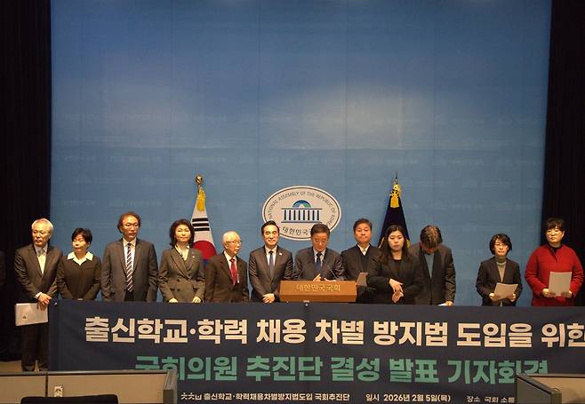 | ▲ 5일 오전, 출신학교채용차별방지법 도입 국회의원 추진단이 국회 소통관에서 기자회견을 열고 있다. |