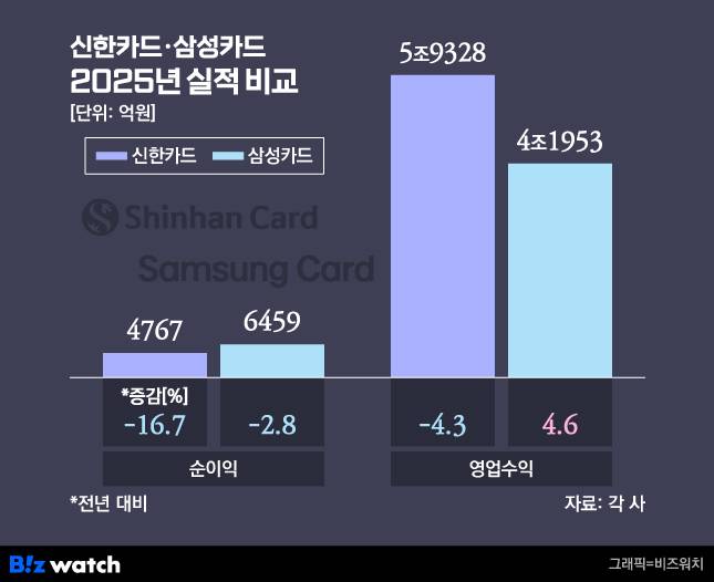 5일 카드업계에 따르면 신한카드와 삼성카드의 지난해 순이익 격차는 1692억원으로 2024년(925억원)보다 767억원 벌어졌다.