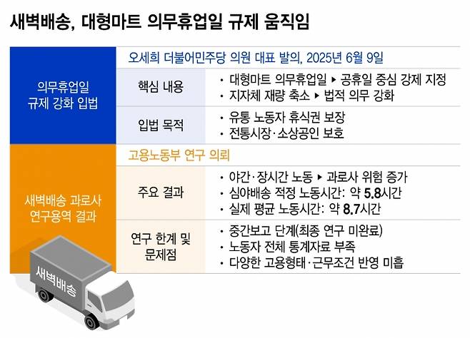 여당이 대형마트와 기업형슈퍼마켓(SSM) 업체의 영업시간 규제를 완화해 쿠팡, 컬리 등 이커머스(전자상거래)처럼 새벽배송을 허용하는 방안을 검토 중으로 알려지자 유통업계에선 기대감과 의구심이 동시에 제기된다.
