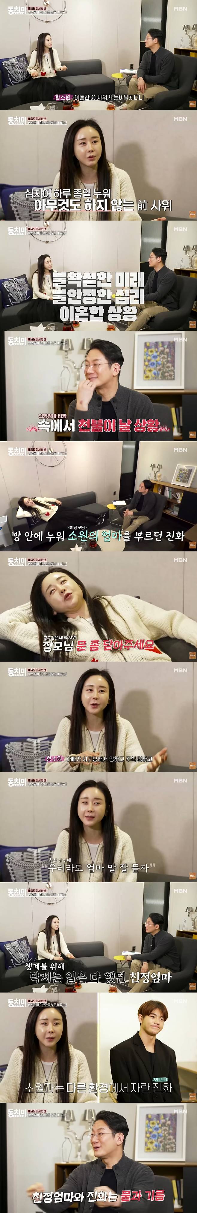 함소원은 "친정 엄마 입장에서 생각해 보면 이혼한 전 사위가 (집으로)들이닥치더니 가지도 않고 이러고 있는데 맨날 누워서 '저게 뭐 하고 있는 건가'라는 생각이 들 것 같다"고 말했다.