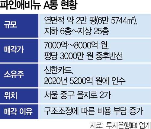 신한카드 측은 파인애비뉴 A동 매각 가격으로 8000억 원을 희망하고 있는 것으로 전해졌다.