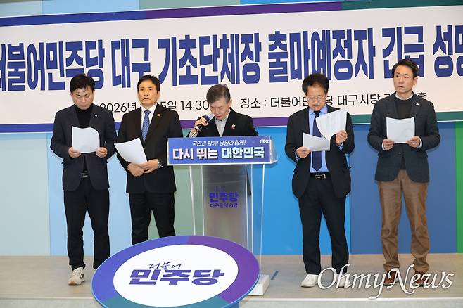| ▲ 더불어민주당 대구지역 기초단체장 출마 예정자들은 5일 오후 시당 김대중홀에서 기자회견을 열고 국민의힘이 발의한 대구경북 행정통합 특별법의 독소조항을 규탄했다. |