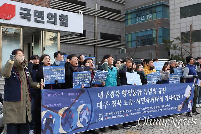 대구시민단체연대회의와 대구경북보건복지단체연대회의, 민주노총 대구·경북본부는 5일 국민의힘 대구시당 앞에서 기자회견을 열고 "기본권을 파괴하는 대구경북특별시 법안을 속도전으로 처리하려는 시도를 중단하라"고 요구했다.