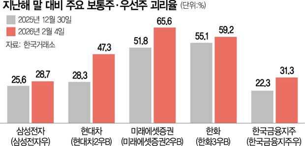 특히 미래 성장 기대감으로 강한 랠리를 펼친 기업들의 우선주 괴리율이 더욱 벌어졌다. 거래량이 폭증하며 달리는 보통주를 우선주가 따라잡지 못한 경우다. 올해 우선주 괴리율이 19%포인트 높아진 현대차(005380)는 연초 CES 2026에서 공개한 휴머노이드 로봇 ‘아틀라스’와 보스턴다이내믹스 기업공개(IPO) 기대감으로 이 기간 보통주 기준 70% 올랐다. 우선주 괴리율이 13.8%포인트 벌어진 미래에셋증권(006800)도 유사한 사례다. 미래에셋증권 보통주는 스페이스X 기업공개 추진 소식에 같은 기간 119% 폭등했다.