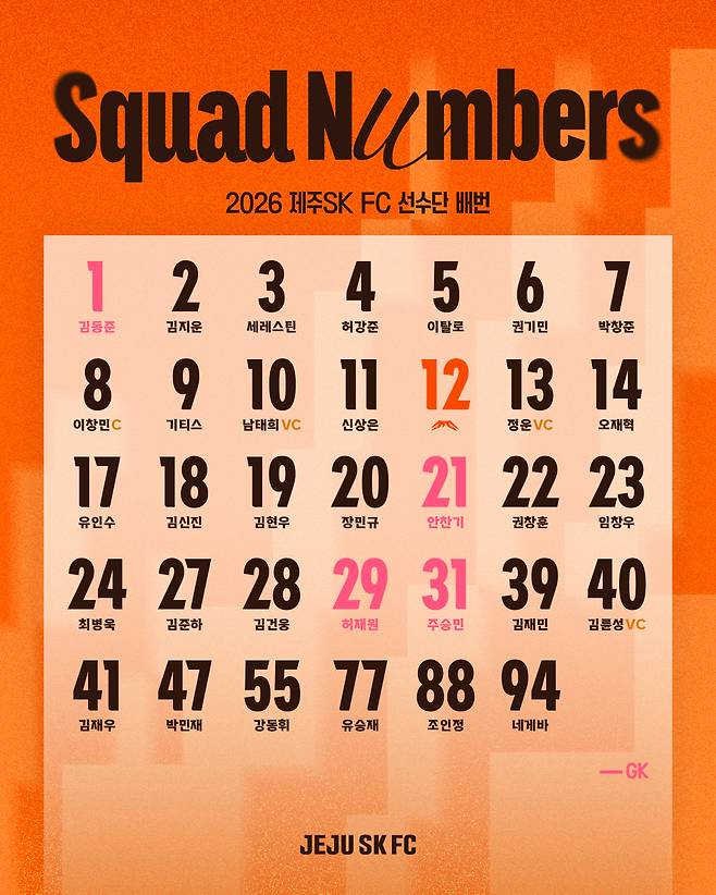 제주SK FC(이하 제주SK)가 2026시즌 선수단 등번호를 공개했다.