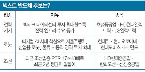 투자자 관심은 차기 주도주에 쏠린다. 넥스트 반도체 후보로는 전력기기·로봇·조선 등이 거론된다. 공통적으로 인공지능(AI) 확산 과정에서 병목을 해소하거나, 기업 생산성을 끌어올리는 데 기여할 수 있는 업종이다.