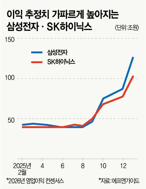 이번 반도체 랠리에서 가장 두드러진 특징은 이익 상향이 일회성에 그치지 않는다는 점이다. 삼성전자와 SK하이닉스 실적 추정치는 지난해 하반기부터 꾸준히 높아지는 추세다. 금융 정보 업체 에프앤가이드에 따르면, 증권사가 추정한 삼성전자 올해 영업이익 추정치는 지난 1월 28일 기준 126조5056억원이다.