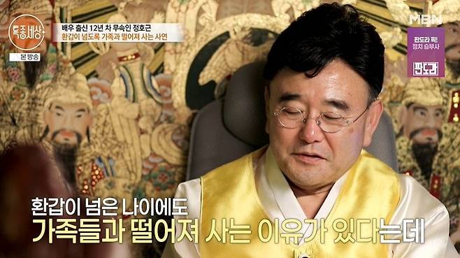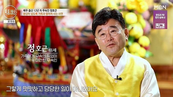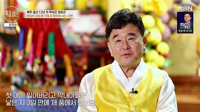 이날 12년 차 무속인 정호근이 등장했다. 정호근은 배우의 길을 포기한 후 근황에 관해 "신당을 운영한 지도 벌써 10년째다. 거의 이곳에서 먹고 자고, 모든 일상을 여기서 한다"라고 밝혔다.