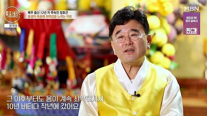 정호근은 세상을 떠난 여동생을 위해 기도했다. 정호근은 "동생도 신내림을 받았다. 허리를 못 쓰고, 못 걷고, 목까지 못 가누게 됐다"라며 "신장을 하나 적출하고 그 이후 몸이 계속 쇠약해져서 10년 버티다 작년에 떠났다"라고 전했다. 정호근은 "죄의식이 생기더라. 모든 것이 내 탓 같다"고 자책했다.