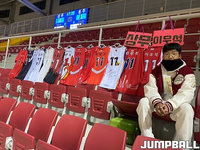 5일 상무와 원주 DB의 2025-2026 KBL D리그 경기가 열린 경희대 국제캠퍼스 선승관. 관중석 한쪽, 난간에 줄지어 놓인 이우석 유니폼 행렬이 시선을 붙잡았다. 이는 이진형(14)군이 이우석을 '좋아하는 마음'을 눈에 보이게 꺼내 놓은 장면이었다.