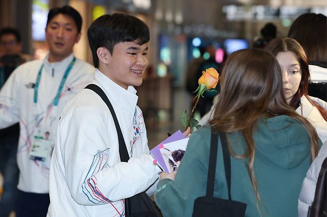 이들을 맞이하려는 인파로 붐빈 입국장에서 가장 뜨거운 관심을 받은 선수는 역시나 ‘피겨 왕자’ 차준환이었다. 베이지색 비니로 멋을 낸 차준환이 모습을 드러내자 팬들이 몰려들어 뜨거운 분위기를 연출했다. 사인과 사진 요청이 몰려든 가운데, 일부 팬들은 미리 준비한 선물과 꽃을 건넸다. 스케이트 부츠를 들고 나와 차준환의 사인을 받은 팬이 활짝 웃는 모습도 포착됐다. 14시간이나 이어진 장거리 비행에도 차준환은 피곤한 기색 없이 팬들과 교감했다.