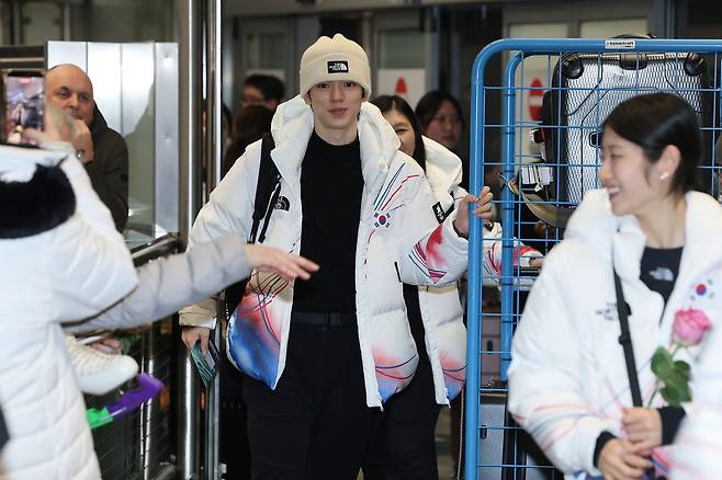 4일(현지시간) 저녁 이탈리아 밀라노의 말펜사국제공항. 고요하던 입국장이 일순 들썩이기 시작했다. 대형 카메라와 스마트폰을 든 이들이 삼삼오오 모여들기 시작하더니 이내 빈 공간을 가득 메웠다. 잠시 후 순백의 단체복을 갖춰 입은 무리가 입국장 문을 열고 등장하자 일대는 뜨거운 함성과 환호, 번쩍이는 카메라 플래시 세례로 가득 채워졌다. 차준환(25)을 필두로 한 한국 피겨스케이팅 선수단이 2026 밀라노·코르티나담페초 동계올림픽 결전지에 입성한 순간이었다.