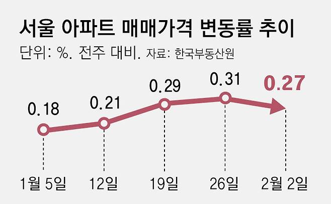 5일 한국부동산원 주간 아파트 가격동향에 따르면 이달 첫째 주(2일 기준) 서울 아파트값은 전주(0.31%)보다 0.27% 오른 것으로 집계됐다. 지난해 2월 첫째 주(0.02%) 이후 52주 연속 상승세다. 상승 폭이 올해 들어 3주 연속 늘어나다가 4주 만에 줄었다.