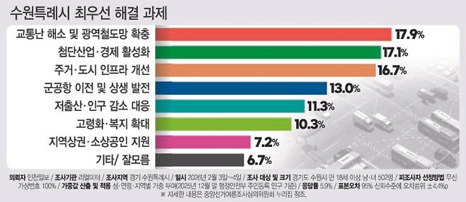 [6·3 지방선거 여론조사-수원특례시] 수원특례시 최우선 해결 과제…권선 “군공항 이전” 장안 “주거 개선” 팔달 “철도망 확충” 영통 “경제 활성화”