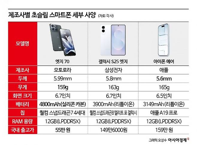 마찬가지로 초슬림·초경량 포지션인 삼성전자의 갤럭시 S25 엣지나 아이폰 에어와 비교해봐도 밀리지 않는다. 엣지 70은 이들 모델보다는 0.3~0.4㎜가량 두껍지만, 무게는 오히려 제일 가볍다. 경쟁 기기들을 직접 사용해봤던 입장에서도 기기의 얇기와 무게는 비슷한 수준이었다.