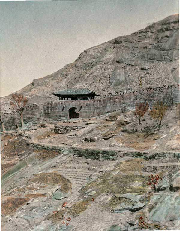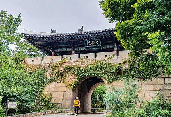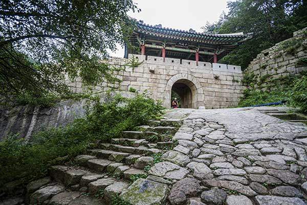 바깥에서 바라본 대서문. 오른쪽에서부터 휘돌아 성문으로 들어가는 길의 모양은 현재도 그대로다. 예나 지금이나 북한산성 안으로 드나드는 사람들의 주 출입구로 애용되고 있다.