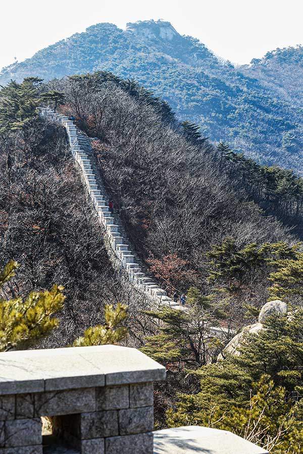 용암문에서 남쪽으로 뻗은 성벽을 바라본 모습. 현대에 이르러 촬영한 사진은 인근의 보국문~대성문 사이의 능선을 따라 이어진 북한산성으로 정확히 일치하는 구도는 아니다.