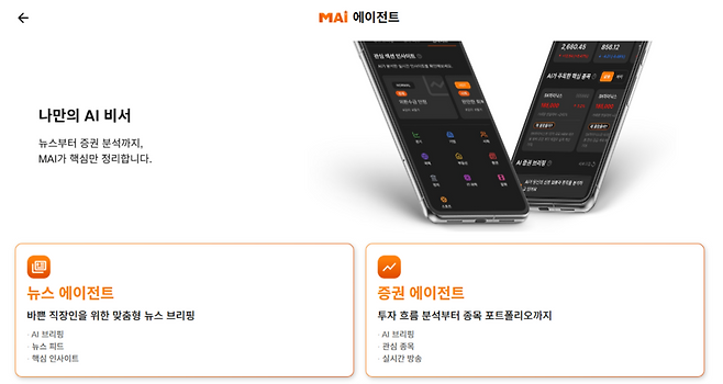 MAI 에이전트는 개개인 맞춤형 뉴스를 추천하는 ‘뉴스 에이전트’와 기사 속에서 주가 변동 이유를 찾는 ‘증권 에이전트’로 구성돼 있다. 뉴스 에이전트의 간판 서비스는 ‘뉴스 브리핑’으로 사용자가 미리 설정한 알람 시간에 맞춰 중요도 높은 뉴스를 압축해 전달한다. 이용자가 나만의 브리핑 일정을 설정하면 매일 아침 혹은 퇴근길 등 지정된 시간에 자동으로 맞춤형 뉴스가 생성되며, 사용자는 경제·기업·사회·국제·부동산 등 총 10개 부문에서 관심 있는 3가지 분야를 선택할 수 있다. 뉴스는 텍스트 또는 AI 기자의 오디오 브리핑으로 전달된다.