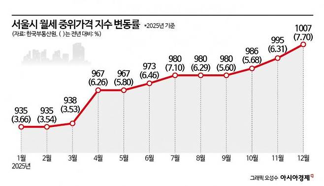 월세도 빠르게 뛰고 있다. 한국부동산원 부동산통계정보시스템(R-ONE)에 따르면 지난해 12월 기준 서울 주택종합 월세 중위가격은 통계 이래 처음으로 100만원을 넘어서며 100만7000원을 기록했다. 전년 같은 달(93만5000원) 대비 상승률은 7.7%로 연간 기준 가장 높은 수치를 기록했다. 월세 중위가격은 해당 달 거래된 모든 월세 금액을 나열했을 때 가운데에 해당하는 값이다. 일반 세입자가 부담하는 보편적인 월세 수준을 의미한다. 지난해 12월 서울 아파트 월세 중위가격도 124만원으로 사상 최고치를 기록했다.
