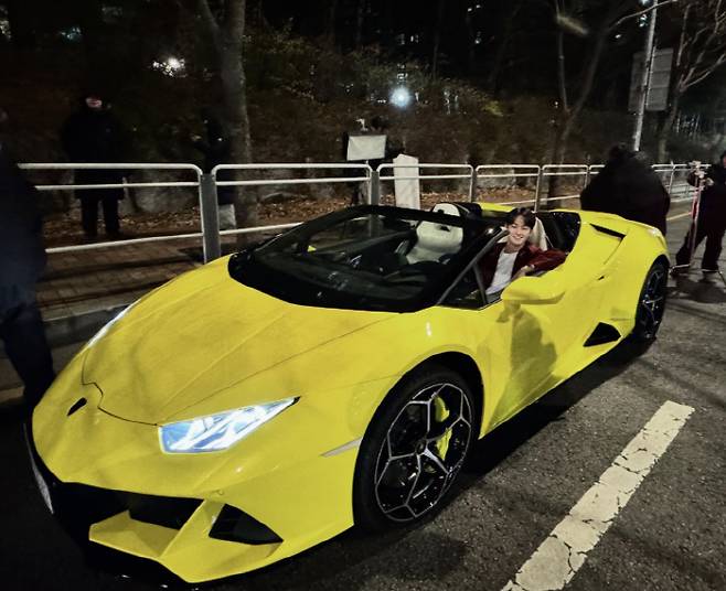 공개된 사진 속 장동주는 억대의 노란색 람보르기니 스포츠카에 탑승한 채 한쪽 팔을 들어 올리고 미소를 짓고 있다.