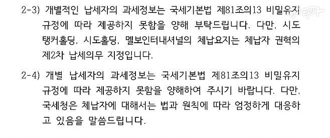 뉴스타파가 보낸 다른 질문에는 국세청이 답변을 했다. 그러나 그 답변들은 대부분 안 한 것과 마찬가지인 답변들이다. 예를 들어 보자.