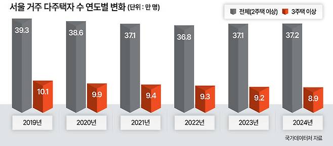 ‘처분가능한 주택’을 가진 다주택자수가 감소세인 것도 기대를 낮춘다. 앞서 이뤄진 다주택자 규제로 ‘똘똘한 한 채’ 현상이 심화한 데 따른 것으로, 서울 거주 다주택자는 2019년 39만3000명에서 2024년 37만2000명까지 줄었다. 3주택 이상 다주택자 수도 2019년 10만1000명에서 2024년 8만9000명으로 매년 하락했다.