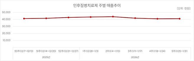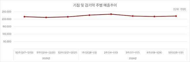 같은 기간 조제건수와 판매건수, 판매금액이 모두 증가세를 보이면서, 겨울철 위장관 증상 관련 의약품 수요가 약국 현장에 반영되고 있다는 분석이다.