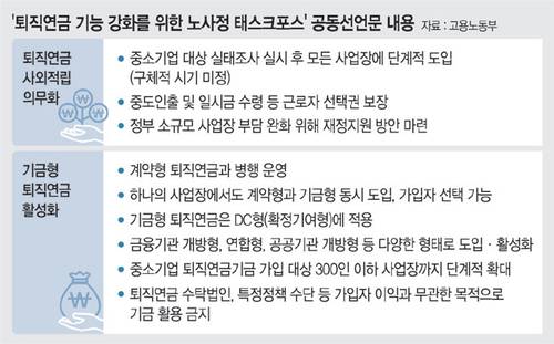 이번 합의안은 모든 사업장에 단계적 도입을 명시하고, 구체적 도입 시기는 추후 논의 과제로 남겼다는 점에서 ‘선언적 의미’가 있다는 평가도 나온다. 1년 미만 근로자의 퇴직급여 보장 방안도 추후 논의키로 했다.