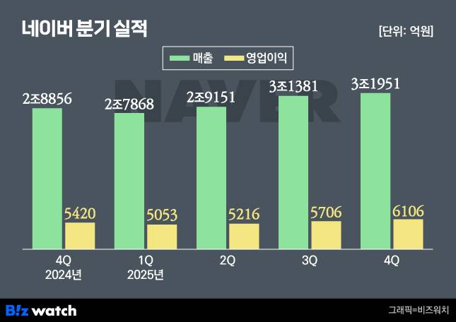 네이버는 연결재무제표 기준 지난해 4분기 매출액은 3조1951억원, 영업이익은 6106억원을 기록했다고 6일 공시했다. 전년 동기대비 10.7%, 12.7% 증가한 숫자다.
