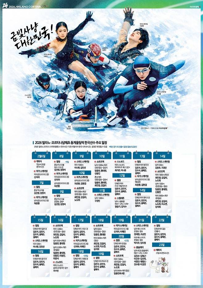 최민정이 이끄는 쇼트트랙 대표팀 경기는 10일 시작된다. 21일까지 총 9개의 금메달 주인공이 가려진다. 첫날인 10일에는 2000m 혼성계주에서 첫 금메달이 결정된다. 이어 13일 여자 500m와 남자 1000m, 15일 남자 1500m, 16일 여자 1000m, 19일 남자 500m와 여자 3000m 계주, 21일 여자 1500m와 남자 5000m 계주 결승이 열린다. 최민정은 여자 1500m에서 올림픽 3연패에 도전하다. 후배 김길리와의 선의의 경쟁이 기대된다.