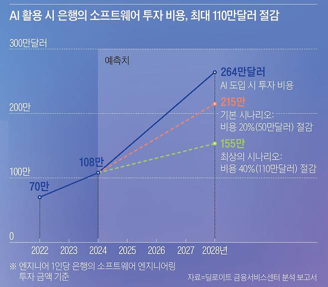 AI 모델이 고도화할수록 소프트웨어 설계, 개발, 테스트, 유지·보수에 이르는 전 과정에서 엔지니어의 생산성은 더 높아지고, 결과적으로 소프트웨어 투자 비용은 감소할 것으로 기대된다. 딜로이트는 AI 도입을 통해 은행 업계가 2028년까지 소프트웨어 투자 비용을 총 20~40% 절감할 수 있으며, 엔지니어 1인당 50만~110만달러(약 7억2000만원~약 15억8000만원)의 비용 절감 효과가 나타날 것으로 전망한다.