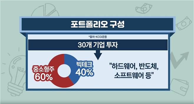 "KCGI 피델리티 미국 AI 테크 펀드는 미국 AI 기업들에 투자하는 상품입니다. 저희는 약 30개 기업에 집중 투자할 계획입니다. 투자 기업들의 특징을 두 가지로 말씀드리면, 첫 번째는 시가총액입니다. 국내 투자자분에 익숙한 빅테크 기업들에는 약 40% 정도 투자할 계획이고, 그 외 국내 투자자분들께 익숙하지 않은 중소형주에는 약 60% 정도 투자할 계획입니다. 두 번째로 산업 측면에서는 하드웨어, 반도체, 소프트웨어 등 다변화된 AI 관련 산업에 투자할 계획입니다."